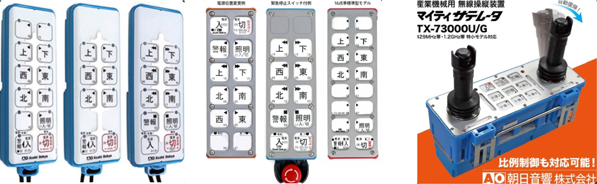 朝日音響の無線操縦装置はさまざまなモデルがあり、産業機械やクレーンなどに使用されています。