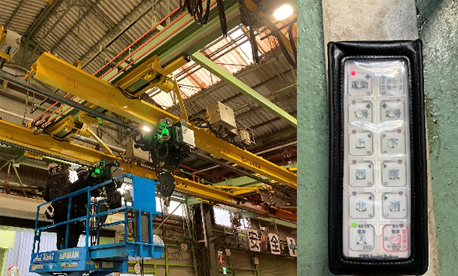 クレーン2基で長尺製品を無線機1台で操作