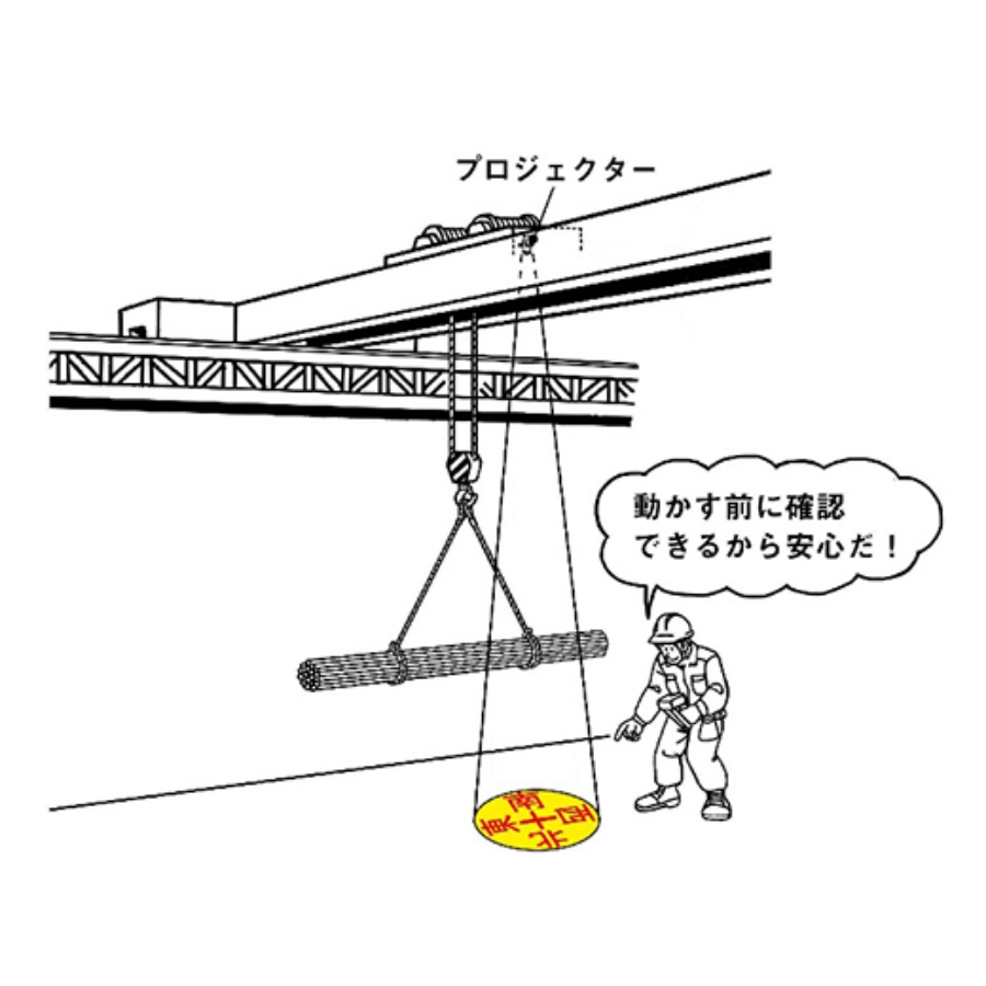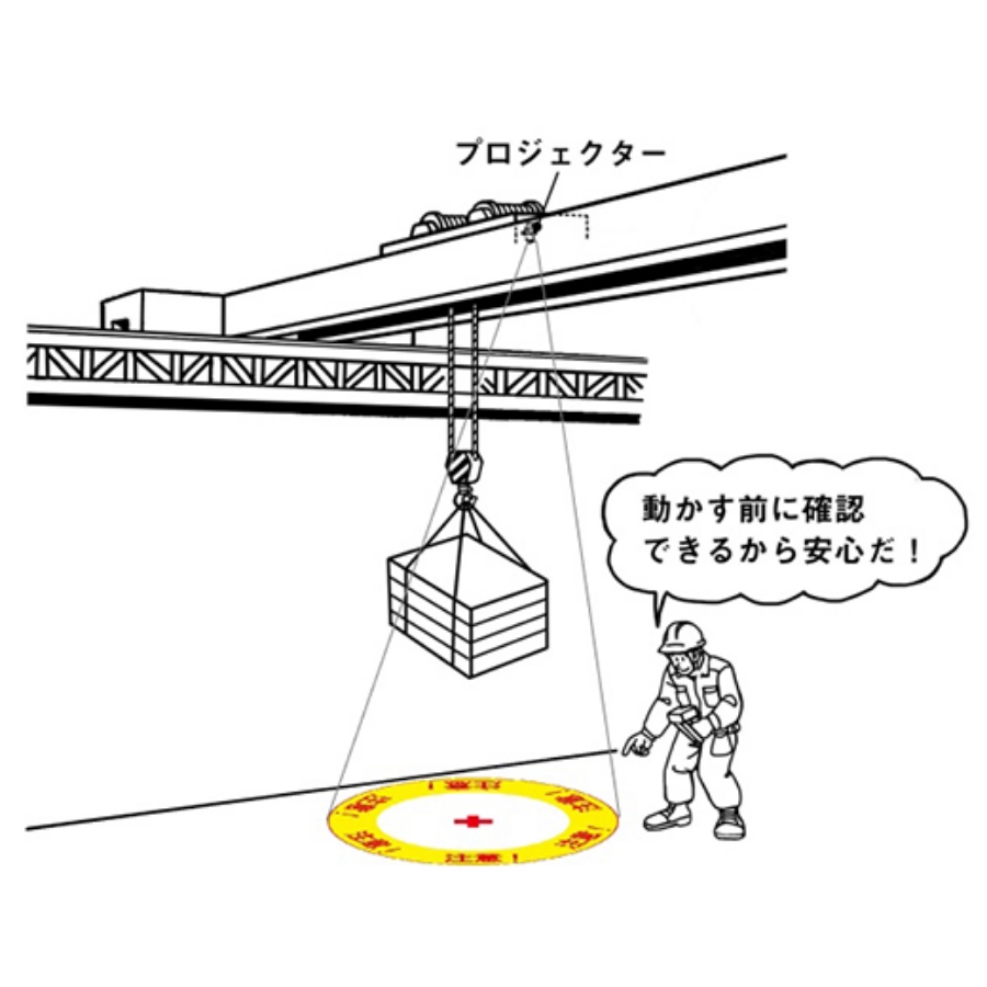 ルートチェックとは、クレーン操作時の吊り荷の位置や移動方向をLED画像で床面に投影し、